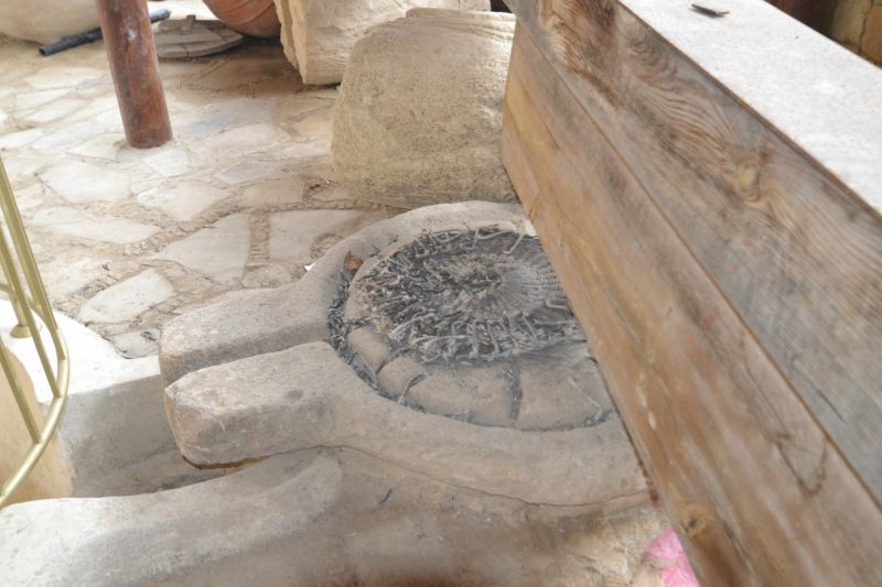 Η βάση του πιεστηρίου έχει το σχήμα του Ρωμαικού λύχνου με ένα κυκλικό αυλάκι ολογυρα και μια εκκροή που επιτρέπει στο υγρό να χύνεται στο λάκκο καθαρισμού