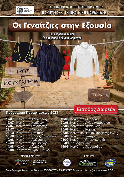θεατρική παράσταση "Οι γεναίτζες στην Εξουσία", από τον Θεατρικό Όμιλο Ένωσης Κοινοτήτων Λεμεσού. Είσοδος ελεύθερη.