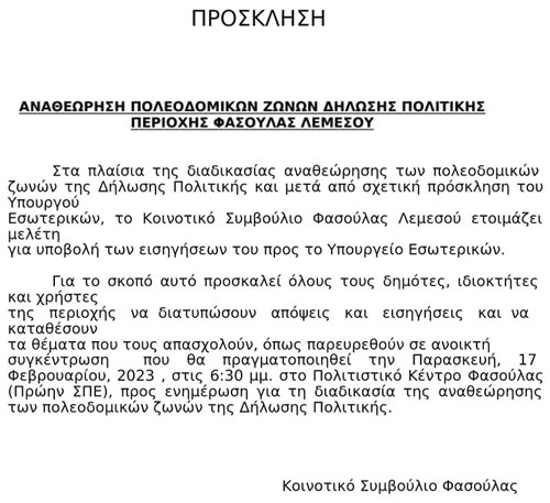 Πρόσκληση - Αναθεώρηση Πολεοδομικών Ζωνών Δήλωσης Πολιτικής Περιοχής Φασούλας Λεμεσού